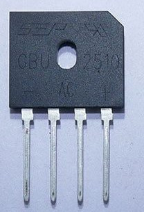 پل دیود GBU2510 : یک پل دیود شانه ای با تحمل ولتاژ حداکثر 1000 ولت و جریان 25 آمپر میباشد. این پل دیود برای منابع تغذیه خانگی و مواردی که به جریان دائمی دارند طراحی شده است.پل دیود GBU2510 دارای یک حفره در وسط آن است که نیاز به استفاده از هیت سینک با آن میباشد.برای اطلاعات فنی دقیق حتما دیتا شیت را مطالعه کنید.