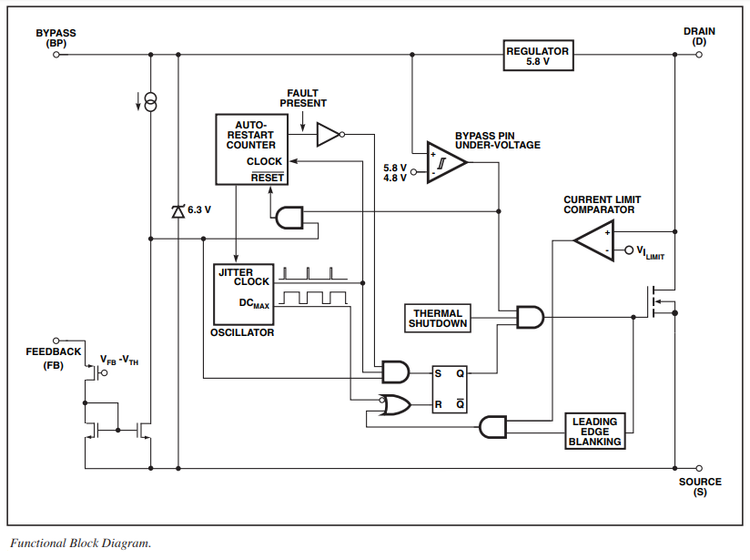آی سی LNK364PN از خانواده آی سیهای سوئیچینگ LinkSwitch-XT با راندمان بالا و توان ۶ وات است که برای استفاده در شارژها، آداپتورها، منابع تغذیه سوئیچینگ صنعتی و سایر کاربردهای مشابه طراحی شده است. این آی سی امکان ساخت تغذیههای سوئیچینگ Off-line (AC to DC) را با کمترین میزان استفاده از قطعات خارجی فراهم میکند. از ویژگیهای برجسته این آی سی میتوان به مدار یکپارچه ریستارت اتوماتیک در هنگام اتصال کوتاه و یا شرایط خطا برای محافظت از آی سی، محافظت حرارتی در هنگام افزایش دما و دیگر محافظتهای ایمنی اشاره کرد. LNK364PN با حداکثر ولتاژ درین ماسفت ۷۰۰ ولت و پیک جریان ۴۰۰mA، عملکرد بسیار بهینهای ارائه میدهد. فرکانس سوئیچ این آی سی ۱۳۲KHz با دیوتی سایکل ۶۰% است.