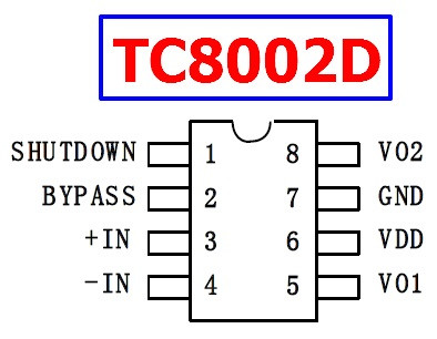 آی سی TC8002D یک تقویت کننده توان صوتی ولتاژ پایین با توان خروجی 1.8 وات روی اسپیکر 8 اهم نوع smd می باشد.